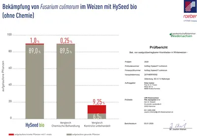 The active steam treatment of the HySeed bio effectively eliminates a broad spectrum of seed pathogens without the use of chemicals. In addition to the relevant laboratory results, the effectiveness has now also been proven by the Plant Protection Service of the Lower Saxony Chamber of Agriculture. The testing was carried out according to the generally accepted rules for the testing of crop protection products.